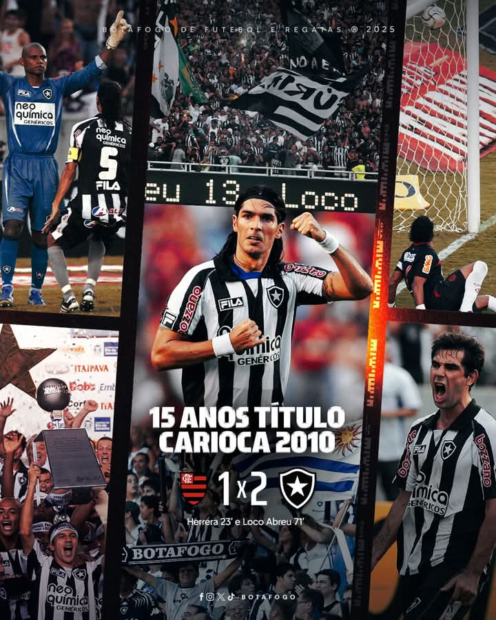 Há 1️⃣5️⃣ anos, Herrera balançava as redes, Jefferson brilhava em penalidade, Loco Abreu anotava a cavadinha que entraria para a história, e o Botafogo vencia a Taça Rio, conquistando o Campeonato Carioca de maneira direta sob o comando de papai JOEL Santana!