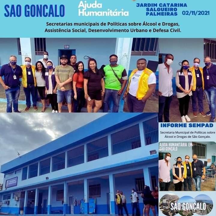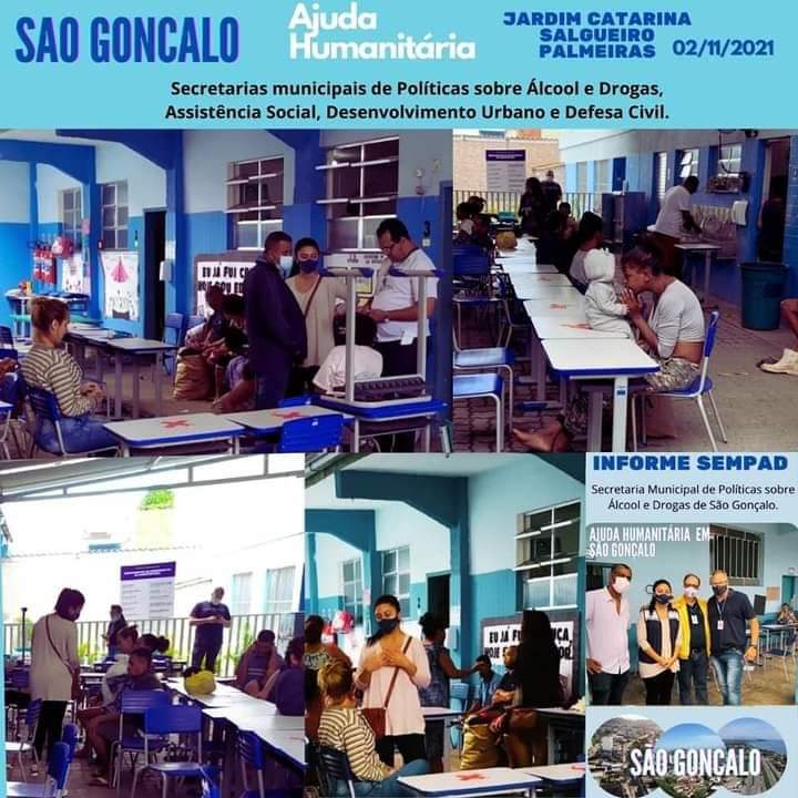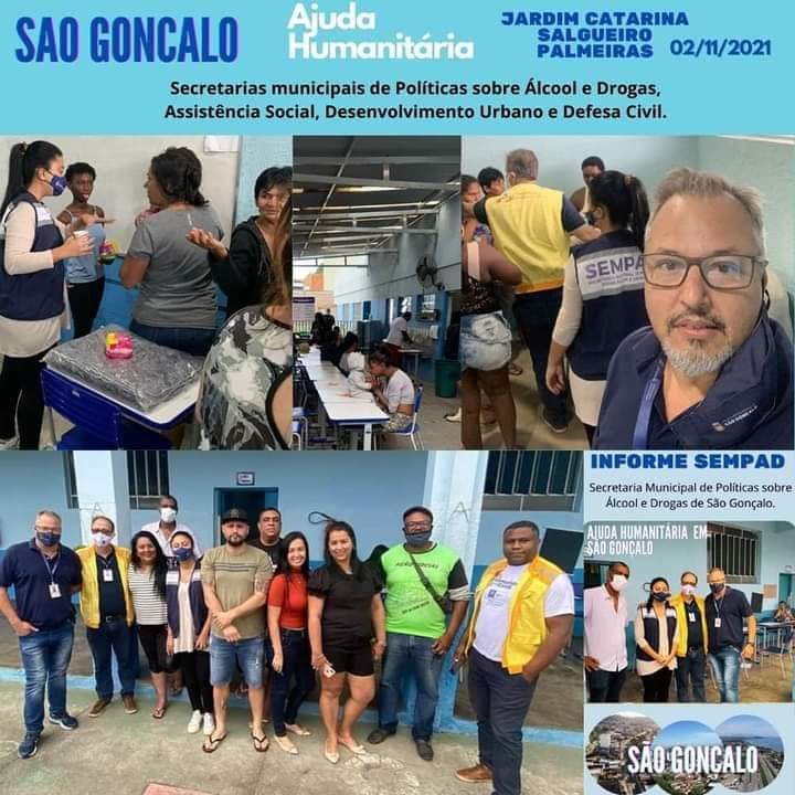 A Secretaria Municipal de Políticas sobre Álcool e Drogas de São Gonçalo esteve dando apoio logístico levando doações como cobertores e KIT Higiênico como absorventes aos desabrigados nos bairros do Jardim Catarina, Salgueiro e Palmeiras neste dia 02 de Novembro de 2021.