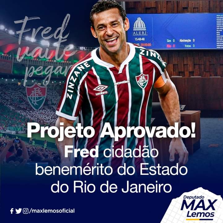 ESTAMOS JUNTOS, FRED! – Foi aprovado hoje na @instalerj a nossa proposta para entrega do título benemérito do Estado do Rio de Janeiro ao atleta Fred, atacante do Fluminense, pelos serviços prestados por ele ao esporte e ao nosso estado.